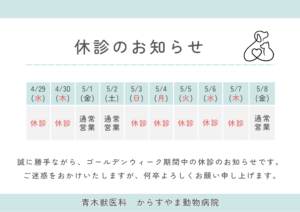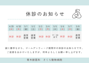 2026.04.21 GW期間中の休診日のお知らせ ゴールデンウィーク期間中の診療についてお知らせいたします。 下記日程を休診とさせていただきます。 からすやま動物病院 さくら動物病院 ご不便をおかけしますが、何卒よろしくお願いいたします。 CT導入に伴い獣医師募集